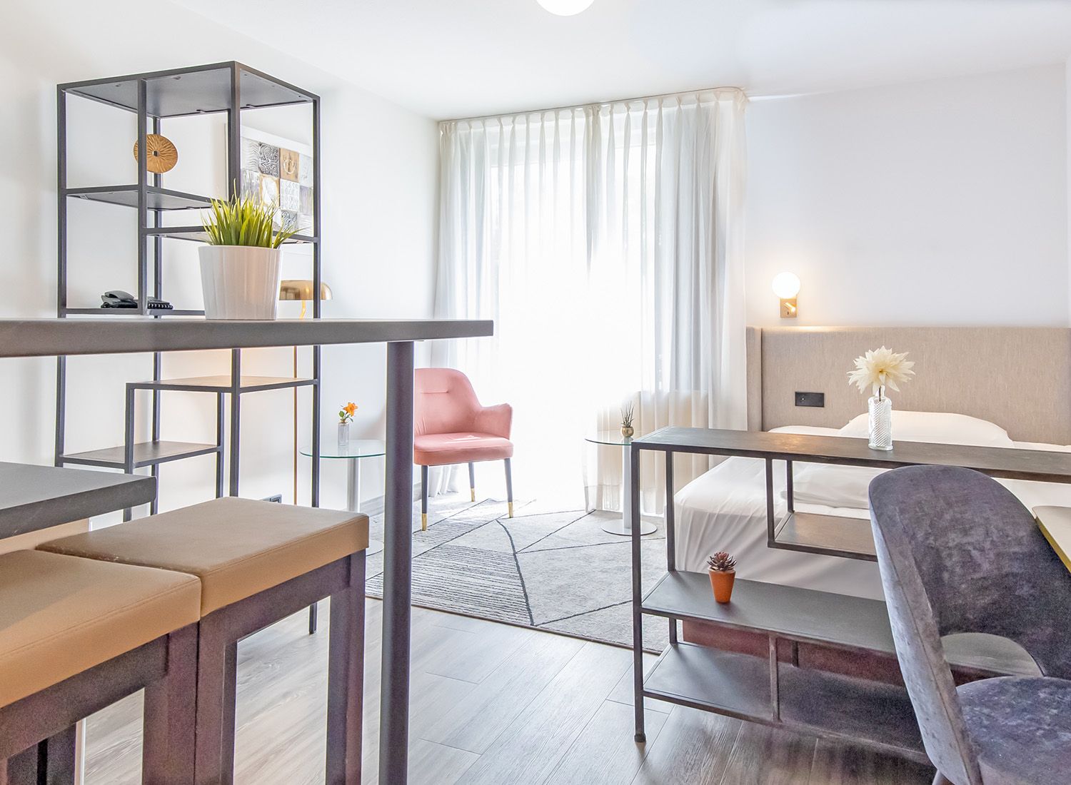 Die Zimmer sind modern und praktisch eingerichtet und bieten alles, was Sie für eine entspannte Übernachtung oder einen längeren Aufenthalt benötigen. Je nach Kategorie stehen zusätzliche Annehmlichkeiten wie Klimaanlage oder mehr Raum zur Verfügung – ideal für noch mehr Komfort während Ihres Aufenthalts.