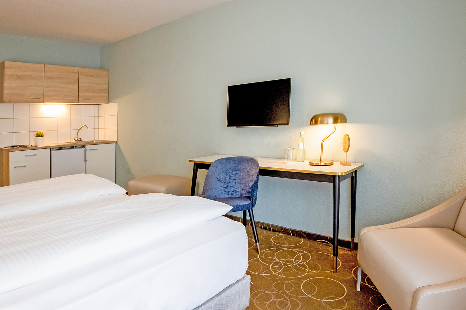 Kostenloses WLAN steht selbstverständlich in allen Zimmern zur Verfügung. Einige Zimmerkategorien eignen sich außerdem besonders gut für Familien oder längere Aufenthalte, etwa unsere Studios mit Kitchenette. Auch Hunde sind bei uns willkommen. Für Ihren vierbeinigen Begleiter berechnen wir 15 € pro Nacht.